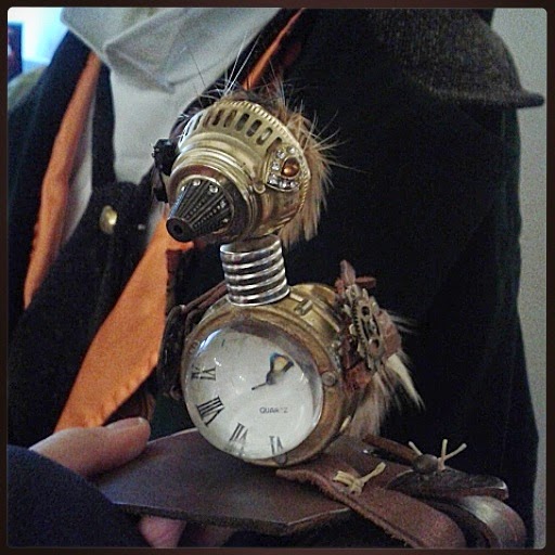 Visited some friends who are BUILDING amazing steampunk cosplay costumes. This little guy is a canary that sits on the shoulder of a steampunk miner.